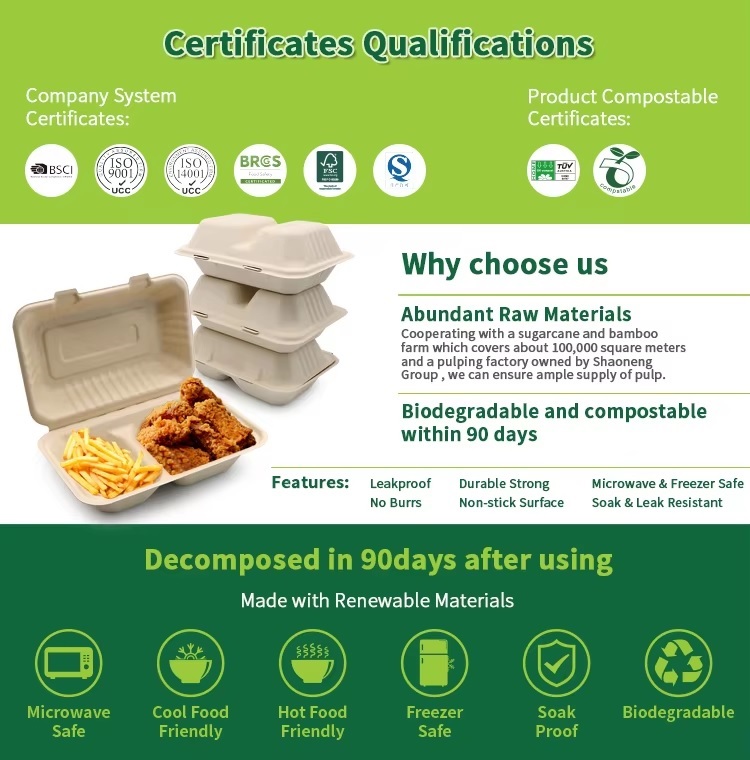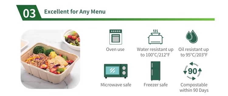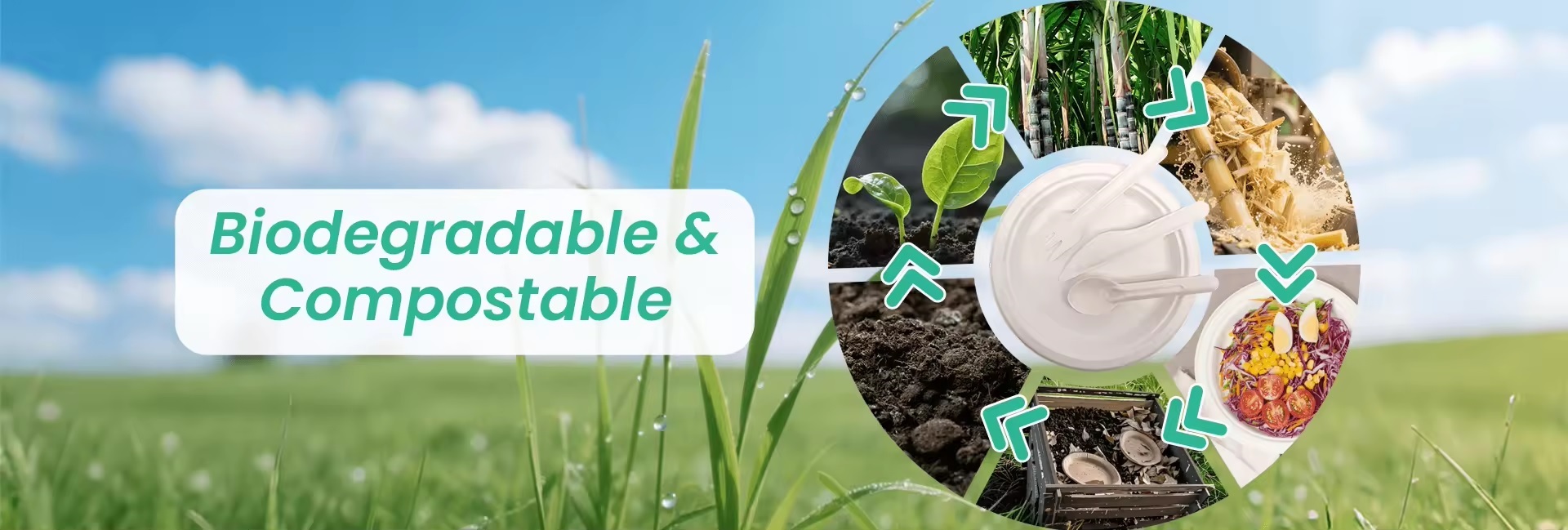 Compostable cutlery, plates, straws, and food containers made from sugarcane bagasse, cornstarch, and PLA.